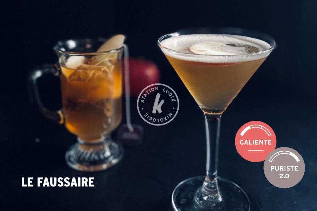 Le Faussaire est un cocktail élégant et épicé. Le thé chaï et le sirop à l’orange épicée rencontrent la pomme dans un martini net, aromatique et légèrement gourmand. En version chaude, on obtient un confort immédiat : chaï fumant, pomme et notes d’orange épicée pour une chaleur douce et enveloppante.